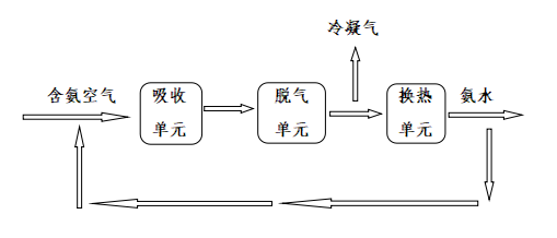 软化水、含氨空气进入氨气吸收器,不断循环吸收并脱除不凝气体制备所需浓度的工业氨水。用在线温密计快速检测出氨水浓度,作为系统工艺调节的依据。分离的不凝性气体夹带少量氨气从氨水贮槽中排出,进入尾气喷淋塔装置喷淋吸收,不凝气达标排放;高温气体与氨溶于水中放出的大量热量被循环冷却水带出送凉水冷塔冷却后循环使用。